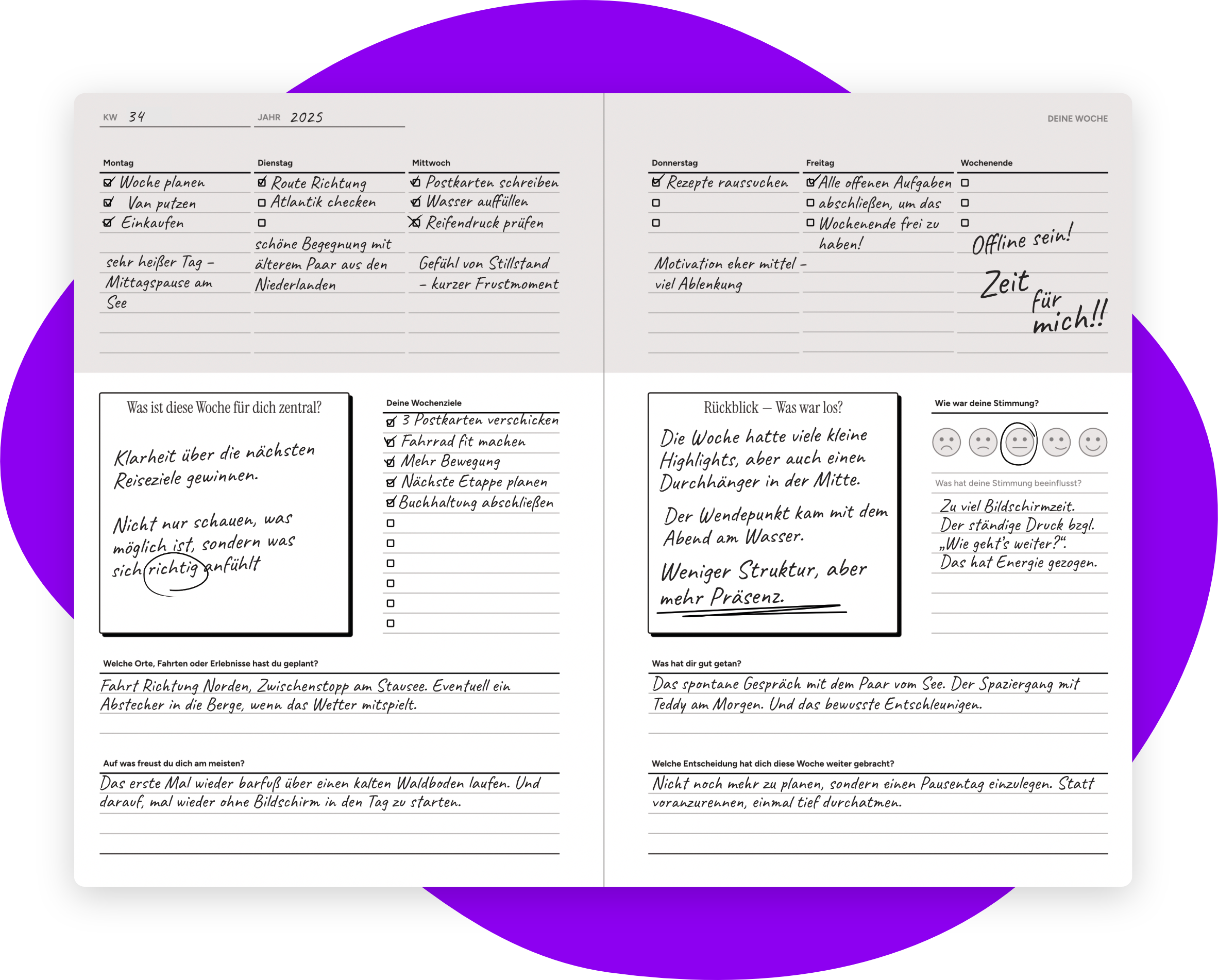 Im Rückblick schaust du, was dich und deine Woche beeinflusst hat. So machst du dir bewusst, ob sich dein aktueller Weg noch richtig anfühlt.